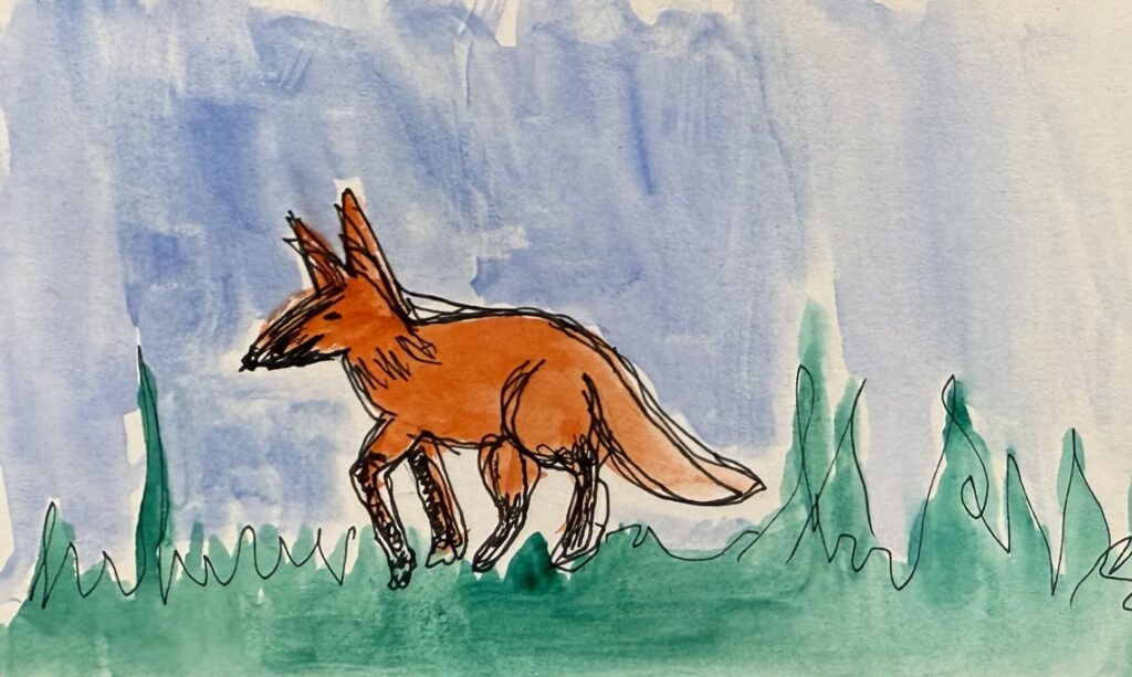 Day 34 – February 3, 2025 (Pen and Inktense pencils) – Red Fox in the Woods