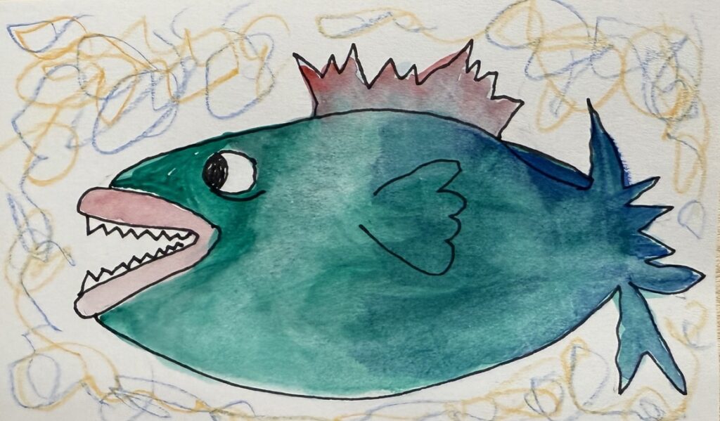 Day 31 – January 31, 2025 (Pen and Inktense pencils) Monster Fish & Little Fish